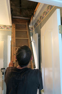We decided it was time to replace the fold down ladder to the upper attic. It is above one of the bathrooms. The guys ran into a problem putting the new one in. The fold out is not as steep as the old one. In the morning they will change it little so the ladder can come down and not hit the top of the door frame. Everything else is pretty well accomplished. A little more wallpaper needs to come off and they will also frame out the inset caddies for shampoos etc in the bathrooms. I didn't blame them for stopping today, that attic work is hot in the afternoons.
