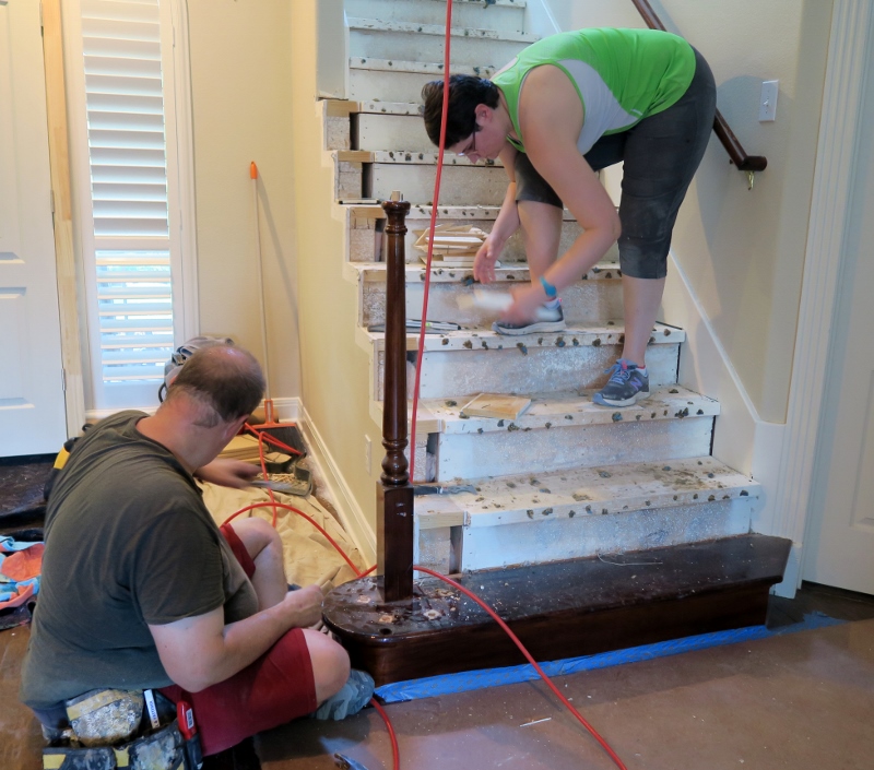 Where you see the open space at the end of each step-that was where the apron was that butted up against the carpet. The wood will run to the edge now